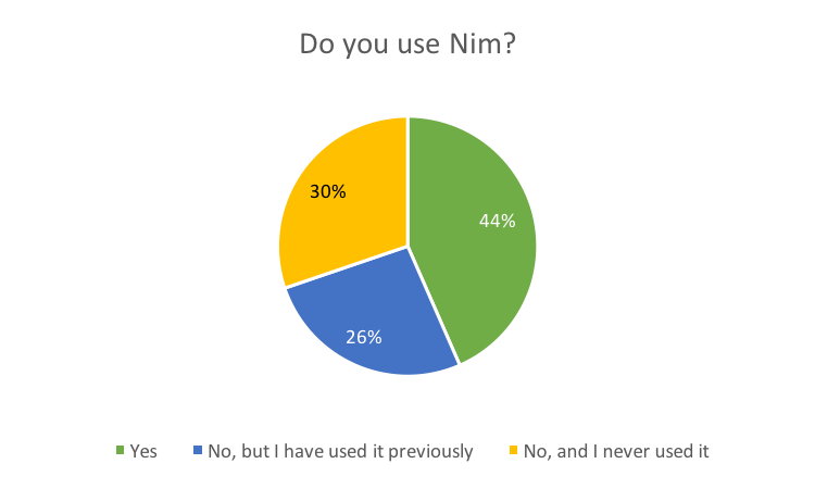 This allowed us to ask each group specific questions. For example, we asked ex-Nim users why they’ve stopped using Nim.