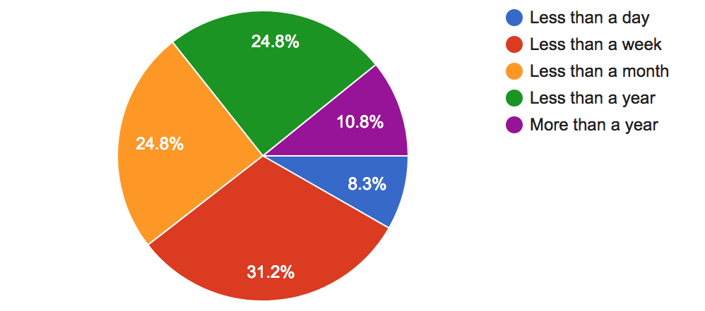 This question is new. It shows that ex-Nim users are fairly equally distributed based on the amount of time they used Nim before deciding to stop.