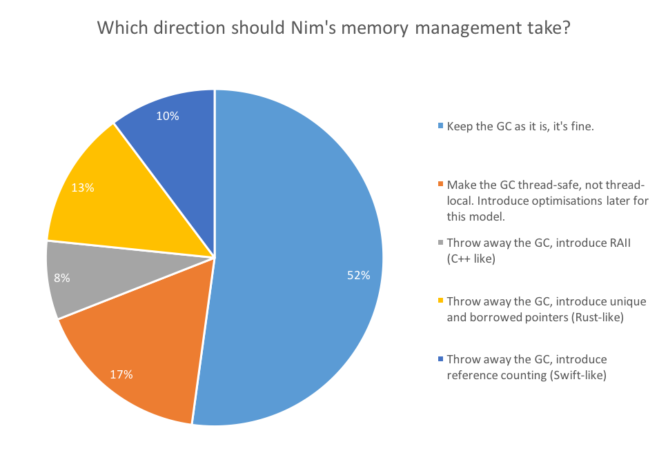 There was a number of free-form answers as well. Most of them spoke about providing all approaches, i.e. the “have the cake and eat it too” approach. Many are conscious of the fact that a GC makes programming smoother so they don’t want the Rust model, but for use cases where it’s necessary they do want it.
