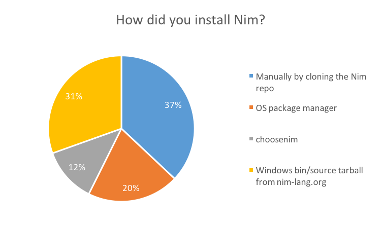 It seems that the majority are still in fact installing Nim by cloning the Nim repo manually. This makes sense as Nim is still evolving quickly, for most people it makes sense to stay on the bleeding edge.