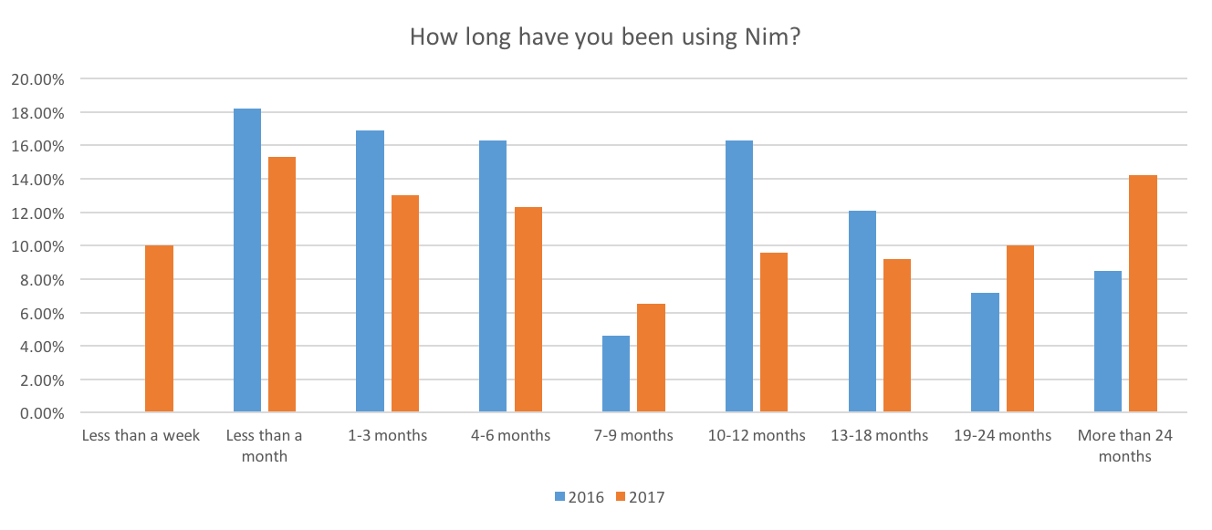 Just like last year, a large proportion of our Nim users are new. This suggests that our community is growing and is a good sign. On the other end of the spectrum we can see that there is a significantly higher number of Nim users that have been using Nim for more than 24 months.