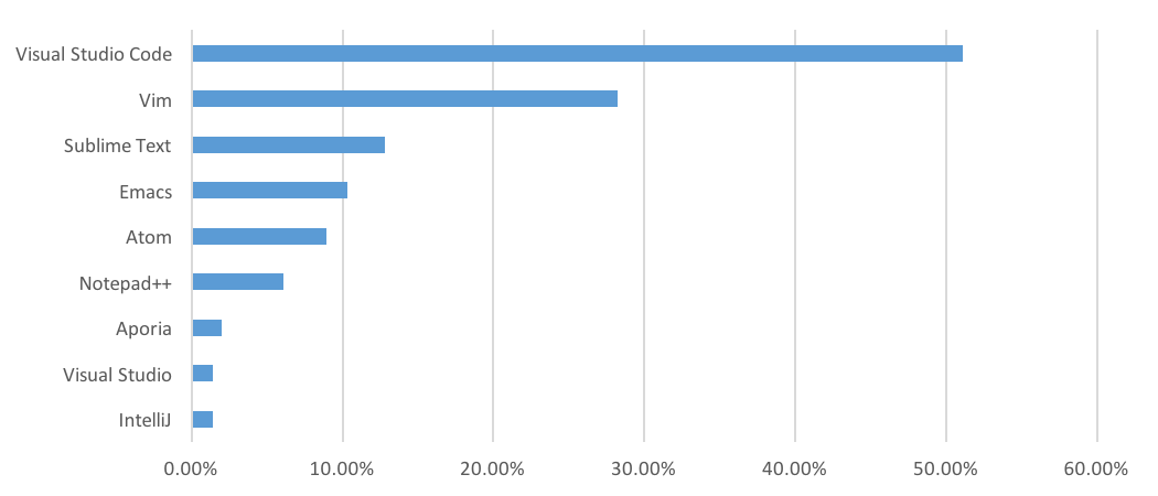 Visual Studio Code continues its dominance and has become even more dominant since the last survey. 51% of respondents selected Visual Studio Code, whereas only 35.5% selected it last year.