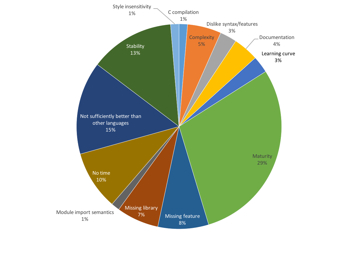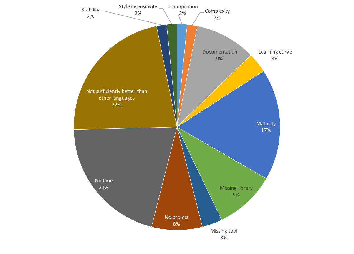 The second reason, categorised as “Not sufficiently better than other languages”, was mostly the respondent specifying that they are happy with another language, or that their project is more suited to another language.