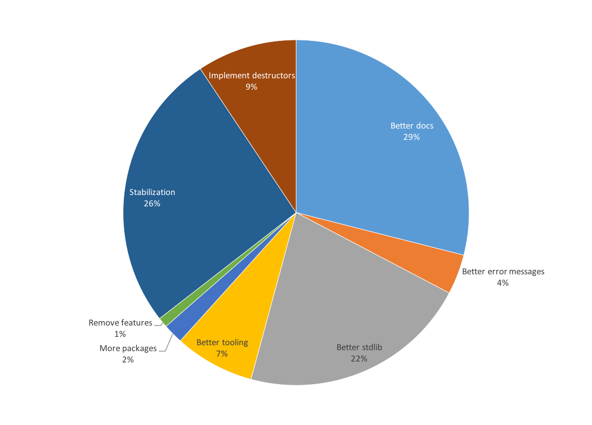 The top three improvements though were, in order, “Better Docs”, “Stabilization” and finally “Better Stdlib”.
