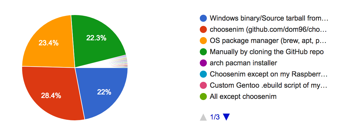 Choosenim takes the crown as the most popular installation method, but only just barely. Other installation methods are also very popular.